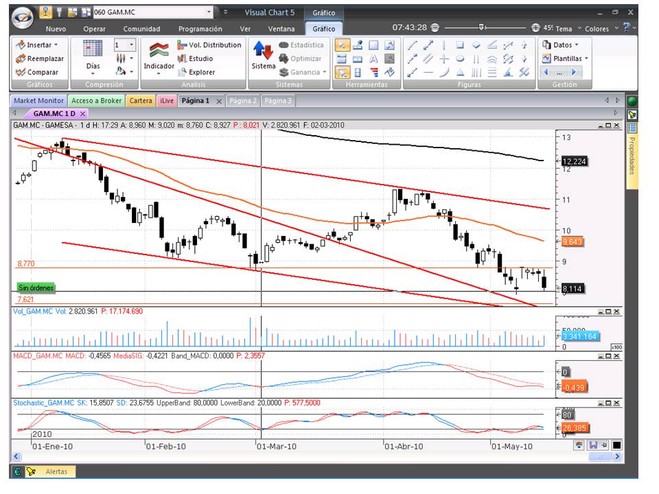 Me he decantado por Gamesa, porque se acerca aniveles muy importantes y, como antes he mencionado, aún no ha llegado, lo que le permite cierta sincronía con el mercado, pues a este aún le puede quedar un tramo a al abaja para después rebotar.